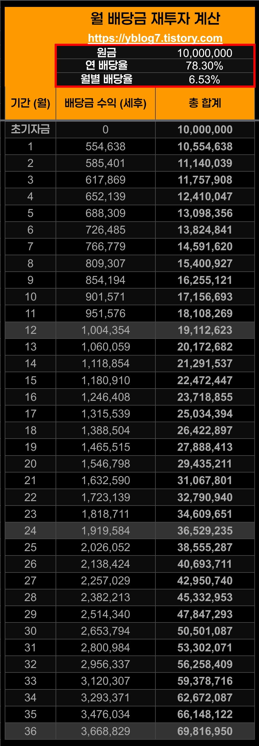 배당금으로 원금만큼 벌려면 약 18개월~19개월로 예측할 수 있습니다.